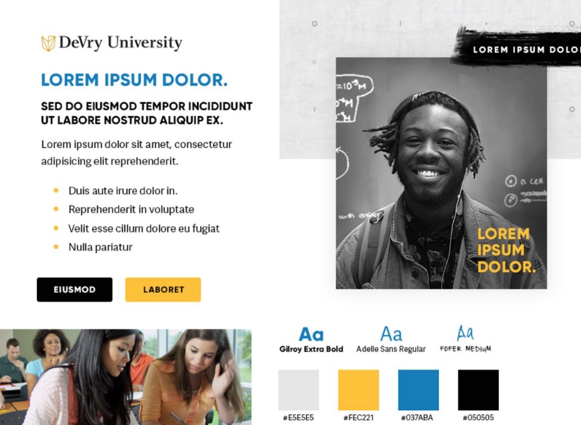 Tasked with repositioning DeVry University during a pivotal brand evolution, we led a rapid, research-driven sprint to uncover strategic gaps and unify the brand. My creative and design direction shaped a new identity system and comprehensive style guide that balanced emotional and rational appeal, designed to bring consistency and clarity across every channel.