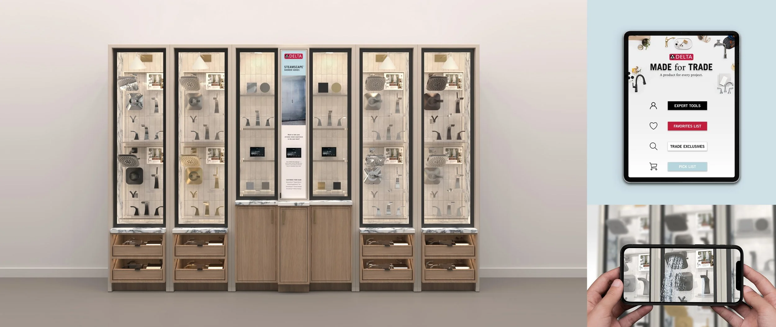 The final concept for the Delta showroom display program was designed to create a "unique trade exclusive experience" that helps Delta stand out from competitors, particularly against online and retail channels. It aims to support conversations and selections for an entire project by showcasing products, inspiration, and pairings.
