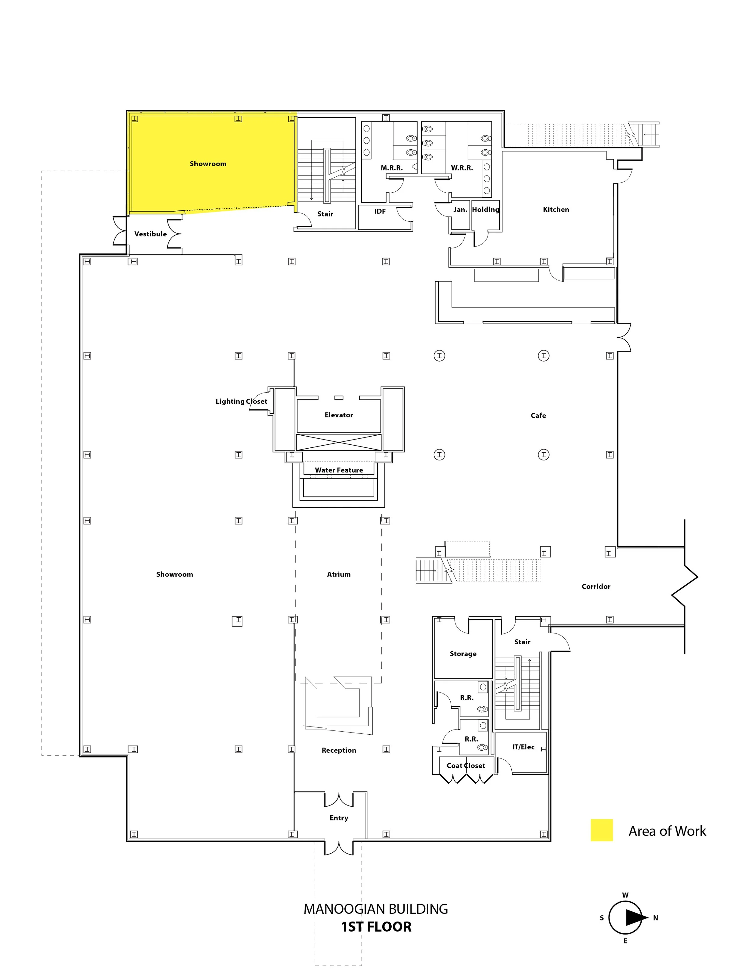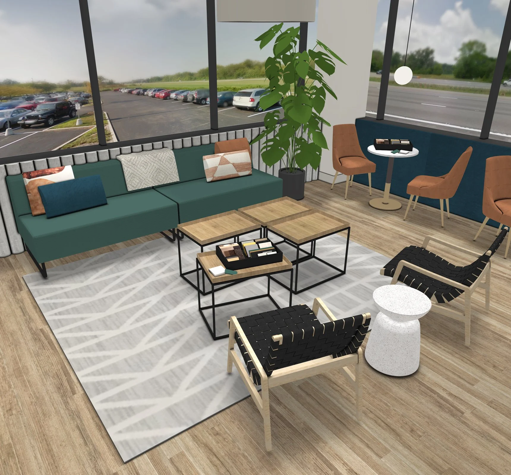 Untapped space potential: No dedicated lounge or work space existed for guests, and I noticed that a prime location adjacent to the showrooms was being underutilized.