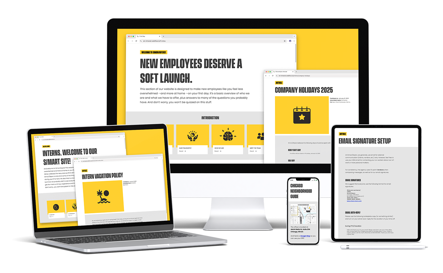 While working at S/M, I noticed that my peers and I were repeatedly asking the same internal questions, such as: dates the office was closed for holidays, PTO policies, and what the best practices were for a handful of things. Our internal communications felt fragmented, and I saw more than just a gap, I saw an opportunity: to make our internal communications just as seamless and inspiring as the brand experiences we create for our clients. I envisioned a centralized, easy-to-update online hub where employees could quickly find what they need.