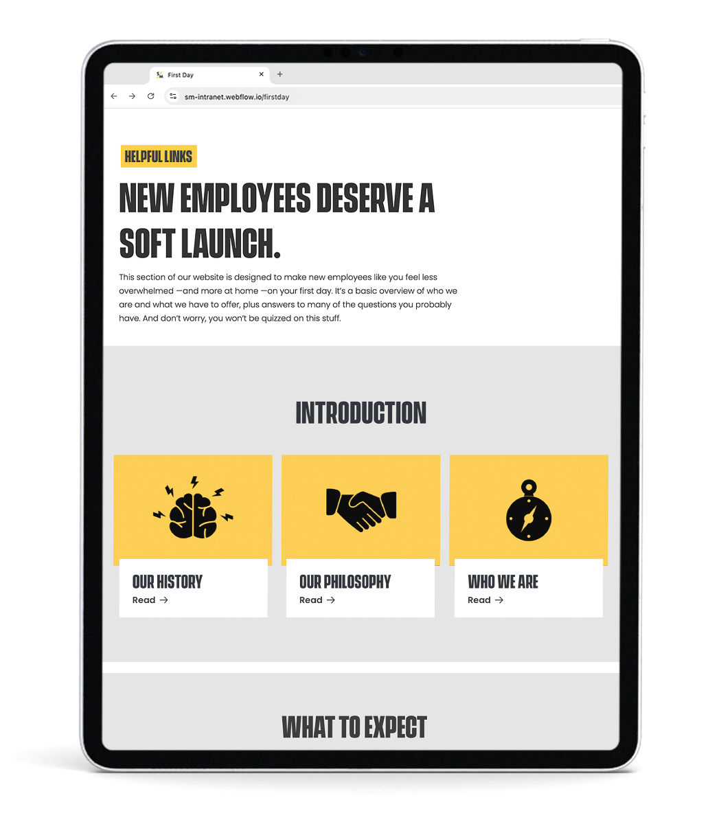 Developed in parallel with the S/Mart Sites, the First Day page was born, a centralized hub with everything a new hire needs to know before, during, and after their first day. It covers essentials like: